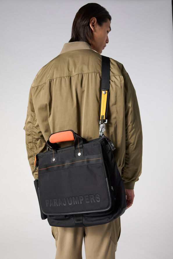 - Detachable shoulder strap with iconic yellow tape and hook